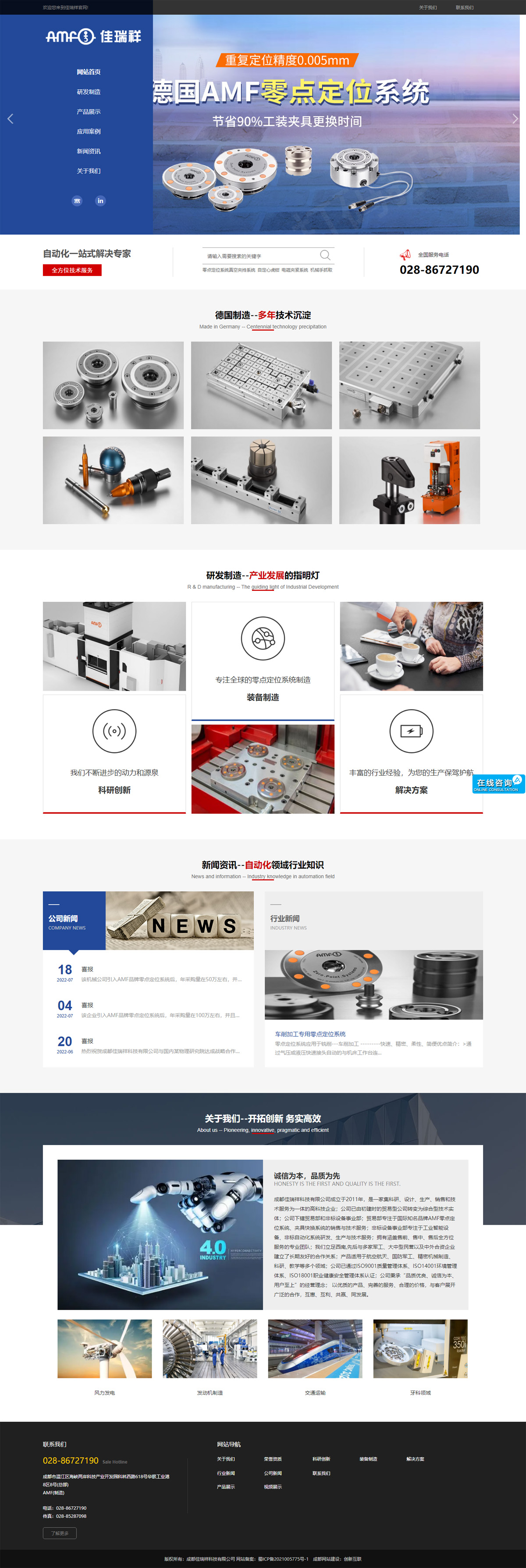 海口佳瑞祥科技有限公司成立于2011年,是一家集科研、设计、生产、销售和技术服务为一体的高科技企业。公司已由初建时的贸易型公司转变为综合型技术实体公司。公司下辖贸易部和非标设备事业部,贸易部专注于国际知名品牌AMF零点定位系统、夹具快换系统的销售与技术服务。非标设备事业部专注于工业智能设备、非标自动化系统研发、生产与技术服务。公司拥有涵盖售前、售中、售后全方位服务的专业团队。